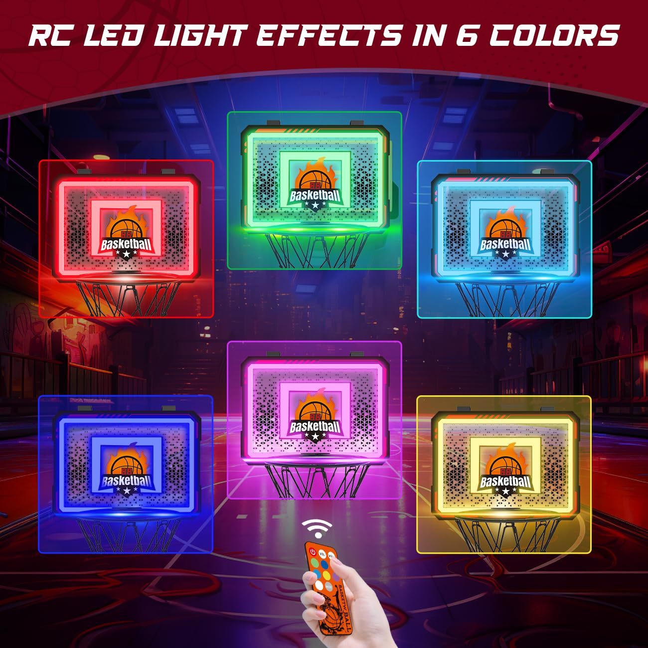 - LED LIGHT&REMOTE CONTROLLER: Indoor basketball hoop with 7 multi-color dynamic light effects, and every time a shot is made, it will trigger a cool light effects. It also has an electronic scoring sensor that can easily record the score of each game. Even better, the included remote control allows to freely switch different sound and light effect modes, creating a relaxed practice environment aor an intense game atmosphere