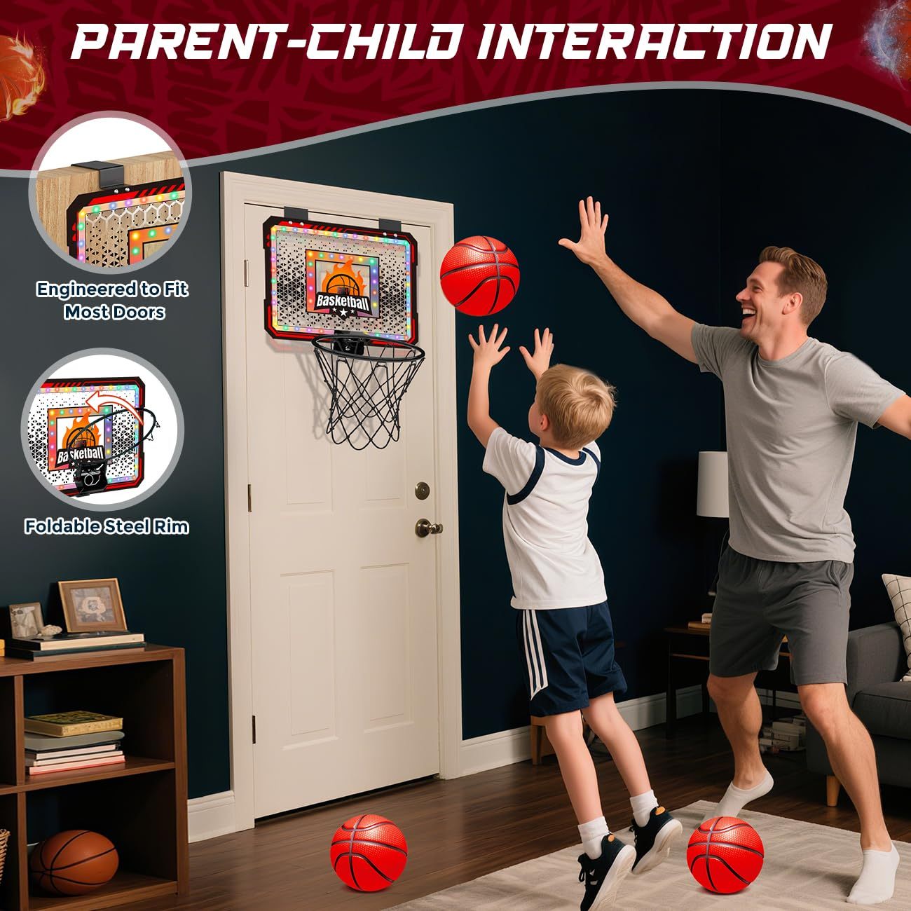 - EASY MOUNT, INSTANT FUN: Basketball hoop set includes clear instructions, making indoor door mounting easily. The innovative hook design ensures compatibility with most door sizes—no drilling required. Simply hang the basketball hoop on any standard-sized door at home, in a dorm, office, or even on a railing in the yard for easy storage and portability. Let your child enjoy basketball anytime and anywhere